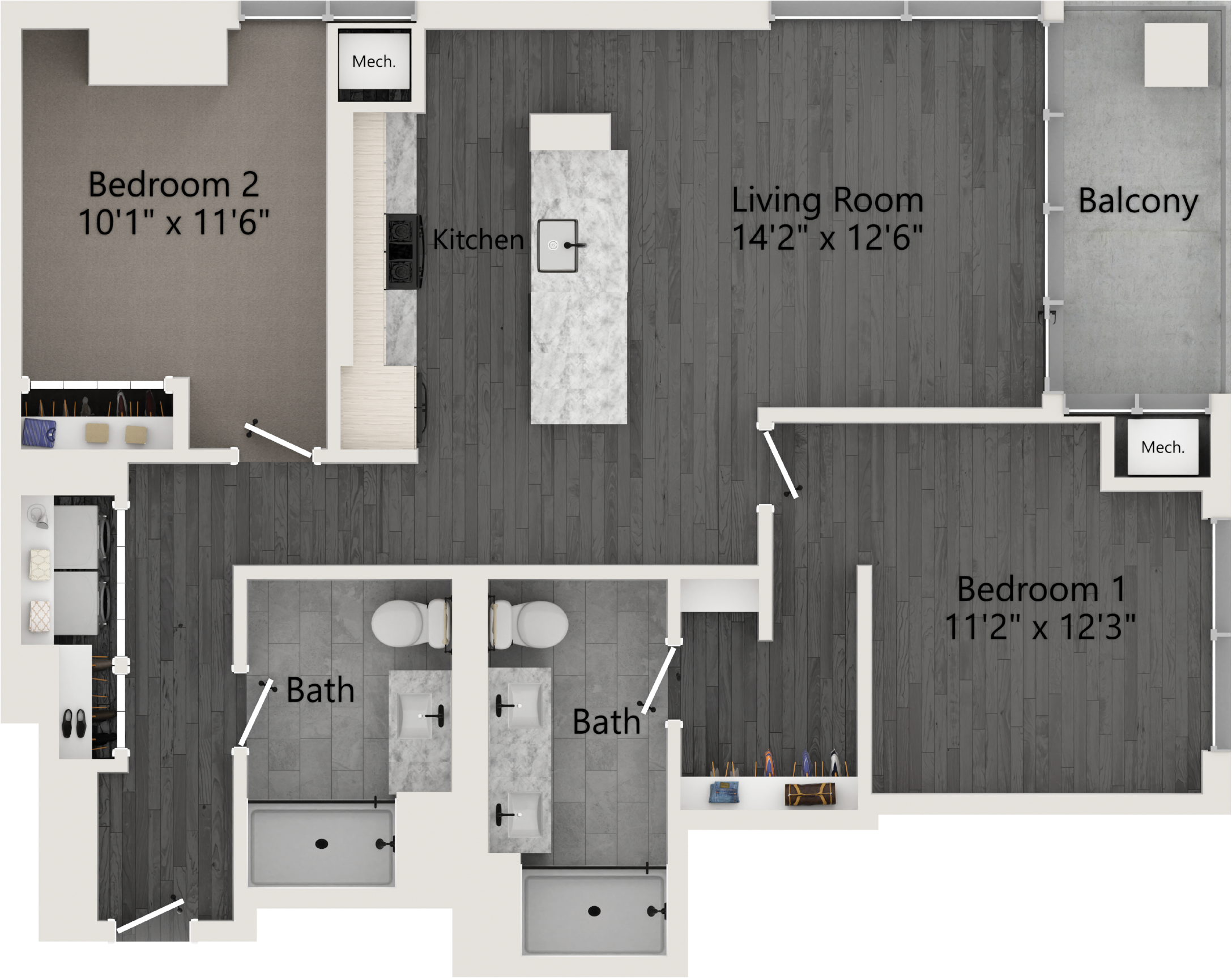 All floor plans are artist’s renderings for illustrative purposes and may not be to scale. All dimensions and distances are approximate and may vary. All photos and views are approximate representations and may not depict actual product. Not all features are available in every apartment. All specifications, availability, and pricing are subject to change.