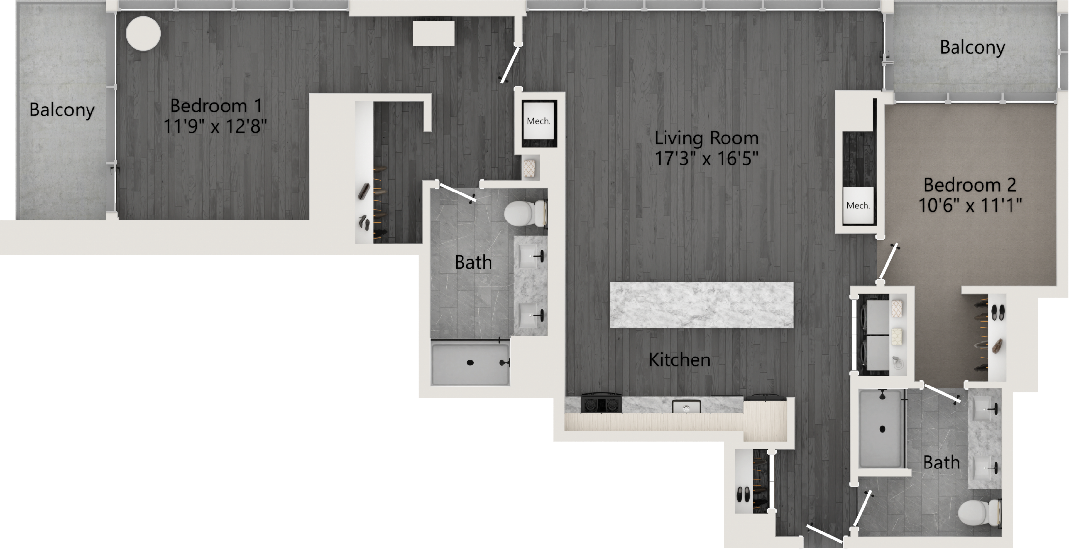 All floor plans are artist’s renderings for illustrative purposes and may not be to scale. All dimensions and distances are approximate and may vary. All photos and views are approximate representations and may not depict actual product. Not all features are available in every apartment. All specifications, availability, and pricing are subject to change.